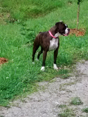 10am update; We are outside, it is such a beautiful day, here comes Roofus yet again and this time he brought a friend a beautiful female boxer without a name tag, she is friendly with the dogs but not so easy around me…